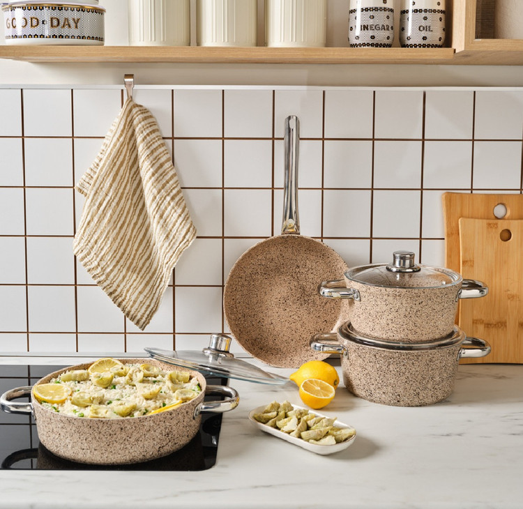 یک عدد قابلمه عمیق قطر 18 سانتی متر همراه درب, یک عدد قابلمه عمیق قطر 22 سانتی متر همراه درب, یک عدد نیم قابلمه قطر 26 سانتی متر همراه درب, یک عدد تابه قطر 26 سانتی متر, قابل شستشو در ماشین ظرفشویی, پوشش داخلی و بیرونی از گرانیت, قابل استفاده در اجاق گازی